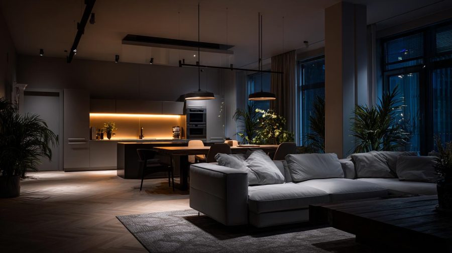 - Создание настроенияс помощью освещения, музыки и температуры — например, режим «вечер» — тёплый свет и музыка, режим «гости» — яркий свет, включение вентиляции.