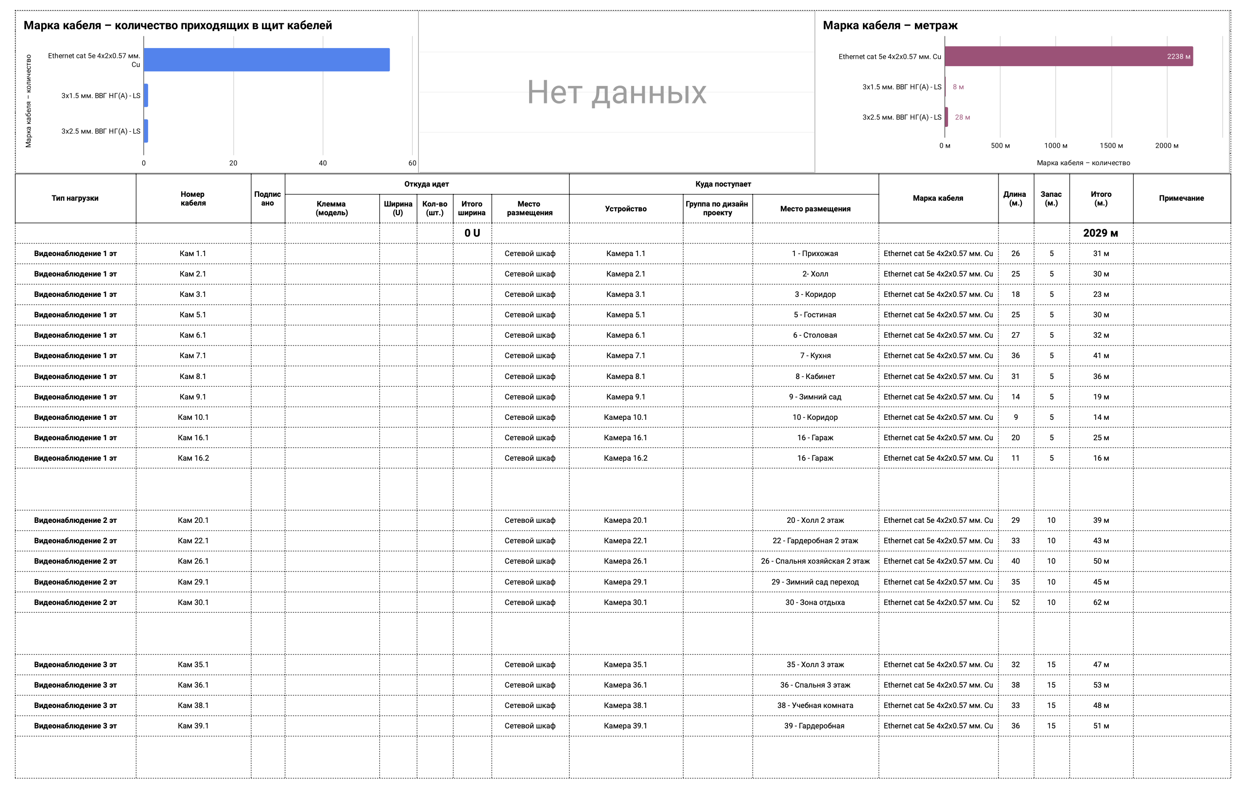 | Кабельный журнал | Список всех кабелей с длинами | Помогает купить нужное количество |