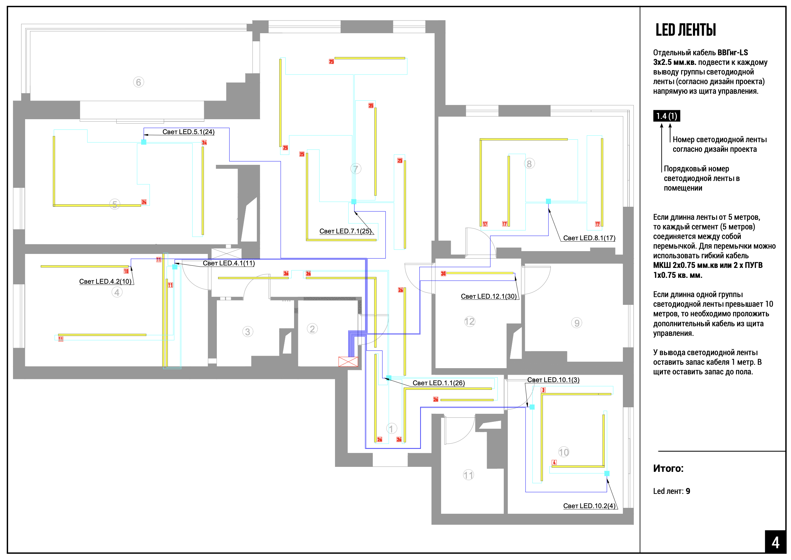 Листы 8-9. Схемы освещения. Группы света, диммеры, датчики движения. Кабельные трассы.
