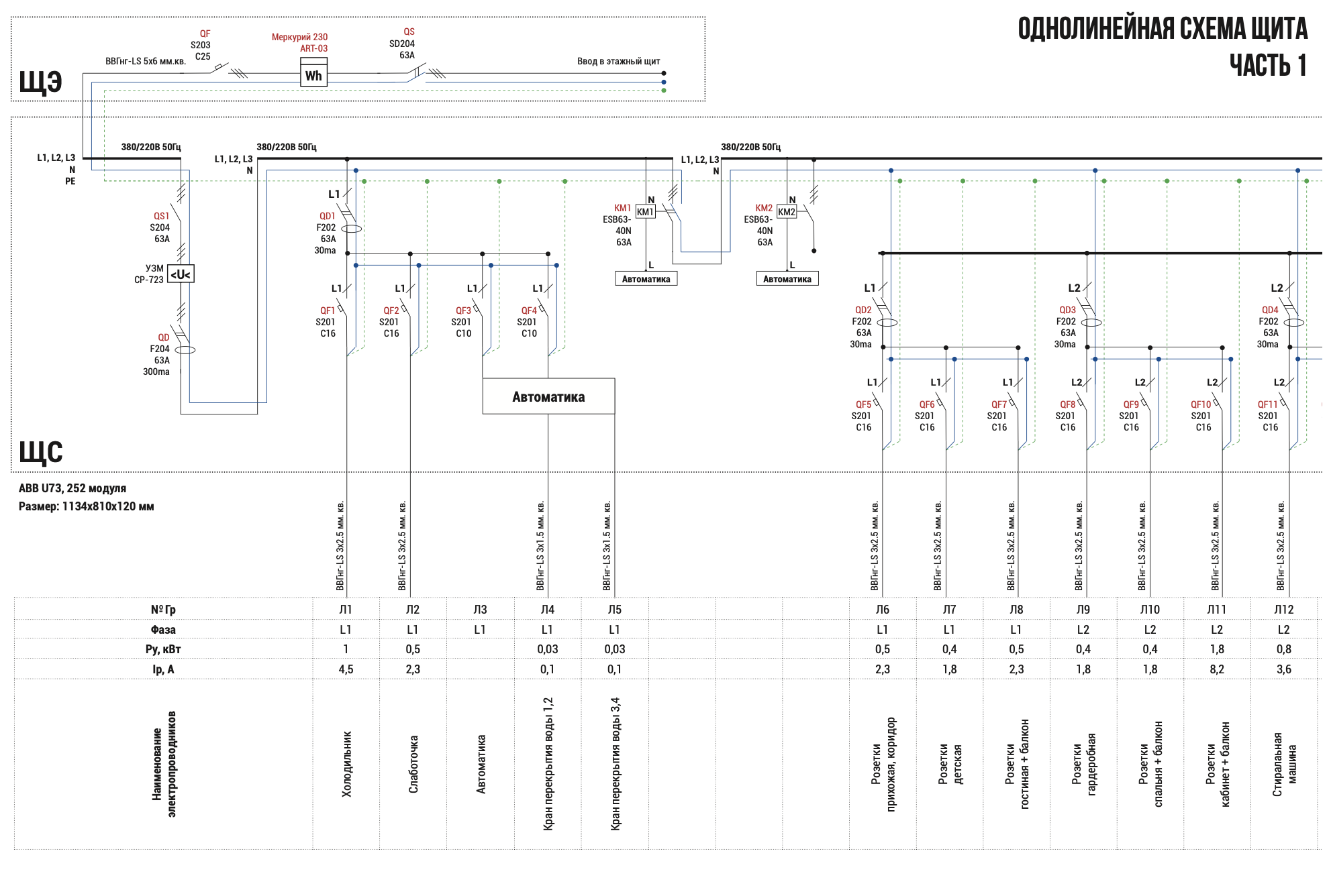 | Электропитание | Однолинейная схема щита | Автоматы, УЗО, реле напряжения |