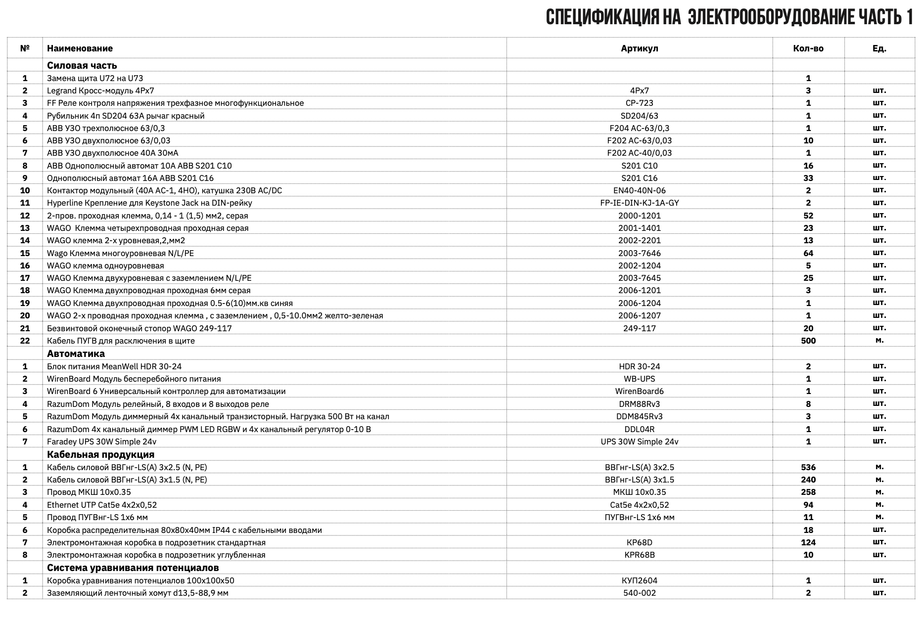 Спецификация — это список покупок. Все датчики, контроллеры, провода с артикулами. Рядом — количество и цена.