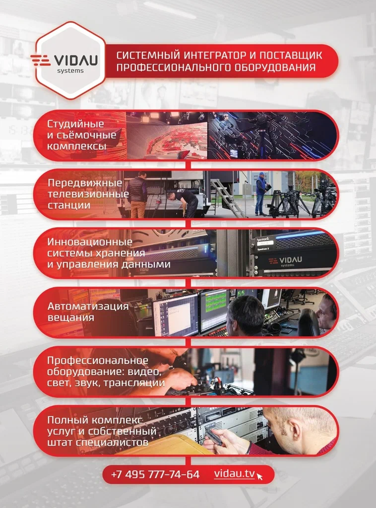 VIDAU Systems предоставляет комплексные решения и оборудование для различных сфер медиаиндустрии, таких как телевидение, кино и радио. Вся деятельность компании направлена на обеспечение высокого уровня качества и надежности предоставляемых услуг и продуктов.